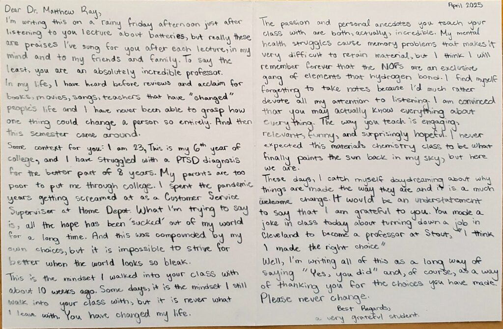 In conclusion, Professor Matthew Ray’s teaching is not just impactful; it is transformative. His ability to make complex subjects accessible and meaningful, his unwavering dedication to his students’ growth, and his encouragement of intellectual curiosity all demonstrate his exceptional teaching abilities. I wholeheartedly recommend Professor Ray for the Teaching Excellence Award, as his teaching is a shining example of the quality and dedication that distinguishes the educators at UW-Stout.